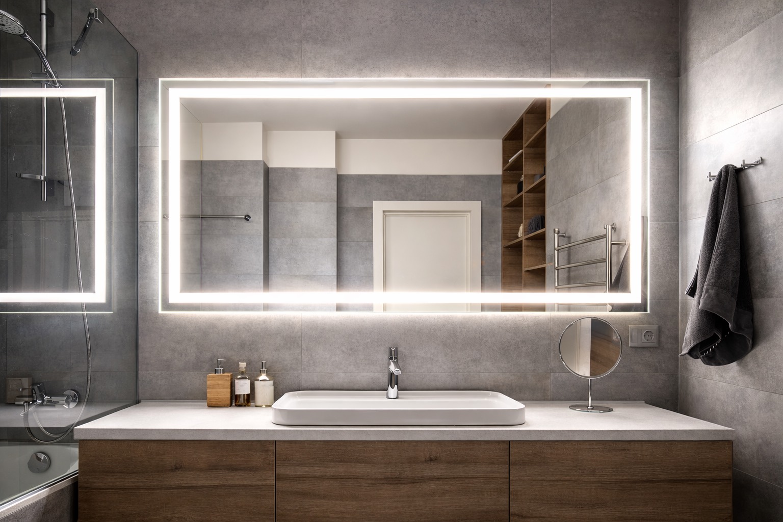 Custom LED bathroom mirrors for hospitality bathrooms, multifamily units, premium residential builds, and branded product lines.